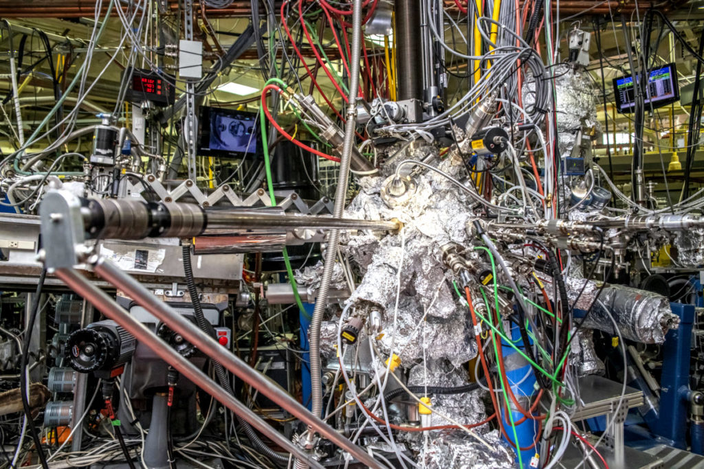 Unikátny tenučký topologický materiál z atómov bizmutu a sodíku (hore) a stroj, ktorým bol materiál vyrobený a testovaný v laboratóriu v Berkeley