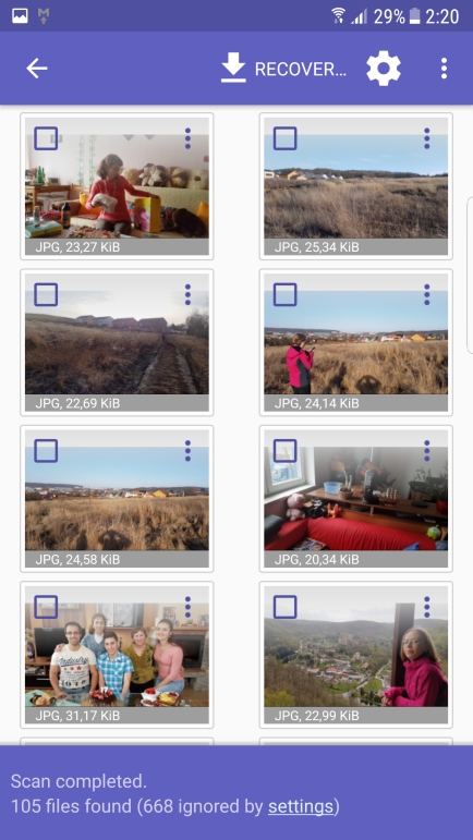 V prípade, že dáta sa nachádzali na internej pamäti telefónu, situácia je značne horšia. Nejde o to, že by bola táto pamäť nejaká iná. Z interného flash čipu telefónu sa dáta obnovujú rovnako ľahko, ako z pamäťovej karty, SSD či pevného disku. Problémom je, že Android v základe funguje pre používateľa s veľmi obmedzenými právami a aplikáciám na obnovu dát (alebo iným) tak neumožní dostatočný prístup k obsahu a uloženým dátam. Príčinou tohto stavu nie je to, že by sa výrobcovia snažili obnove dát zabrániť, ale snaha robiť zariadenia čo najodolnejšie voči útokom škodlivého softvéru, akými sú napríklad vírusy, trójske kone či ransomvér. Niektorým typom súborov toto obmedzenie obvykle neprekáža a obnoviť sa dajú aj tak, pri iných ide o neriešiteľnú situáciu, pri ktorej vám takto obmedzený prístup obnovenie skrátka neumožní. K súborom, ktoré sa obvykle dajú obnoviť aj na takto limitovanom zariadení patria hlavne fotografie. Obvyklý postup je použitie aplikácie, ktorá je na zariadení už nainštalovaná a má teda k jej obsahu aký-taký prístup. Medzi najpopulárnejšie programy tohto typu patrí DiskDigger Photo Recovery, ktorý sa dá stiahnuť v Obchode Play, pričom je celkom zdarma. Problémom pravdaže je, že jeho dodatočným nainštalovaním si niektoré zmazané dáta môžete nechcene prepísať. Nanešťastie, ak ste si zmazali množstvo fotografií, šanca na prepis nejakých je takmer nulová, pretože aplikácia má len 2,5 MB. Ak sa fotky rozhodnete obnoviť touto cestou, program po nainštalovaní spustite a ťuknite na tlačidlo „Start basic photo scan“. Skenovanie bude trvať pár desiatok sekúnd až minút, pričom sa vám obvykle zobrazí veľké množstvo súborov. Aby ste sa nimi nemuseli všetkými prehrabávať, môžete kliknúť na ikonku ozubeného kolieska a zadať rozpätie dátumov, v ktorých viete, že ste fotky odfotili. Následne stačí vybrať tie ktoré vám chýbajú a ťuknutím na tri bodky a možnosť „Recover this file“ ich obnoviť po jednej, alebo označiť viacero naraz a stlačiť tlačidlo Recover. Je dôležité, aby ste fotky neukladali späť na zariadenie. Ak v ňom máte pamäťovú kartu, uložte ich tam. Alternatívou je nahratie fotiek na Google Disk alebo iné cloudové úložisko, prípadne ich poslanie e-mailom či cez komunikačný program Skype, čo vám program všetko ponúkne. Až v momente, ako si obnovíte všetko čo potrebujete, začnite na telefón znovu dáta ukladať.