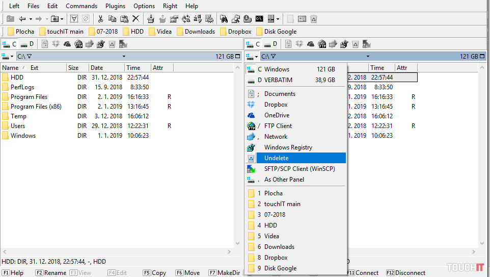 Funkcia na obnovenie sa nachádza v menu Plugins – Undelete. Tiež môžete využiť rozbaľovací zoznam programu a kliknúť na tlačidlo záhlavia pravého alebo ľavého panelu a vybrať položku Undelete. Tak ako je zobrazené na našom obrázku.