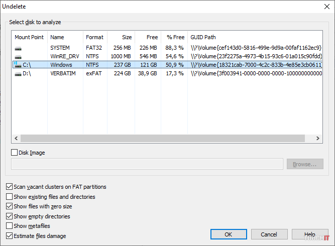 Potom sa zobrazí okno s dostupnými úložiskami. Vyberiete disk a stlačíte tlačidlo OK na začatie hľadania. Súbory, ktoré sa zobrazia v paneli potom môžete obnoviť. Odporúčame vykonať obnovu na iné miesto. Napríklad na flash disk, aby ste si pokusom o obnovu daný súbor neodstránili.
