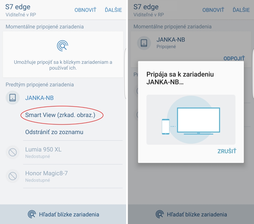 Vysielanie obrazu cez Miracast na smartfóne Samsung Galaxy S7 Edge