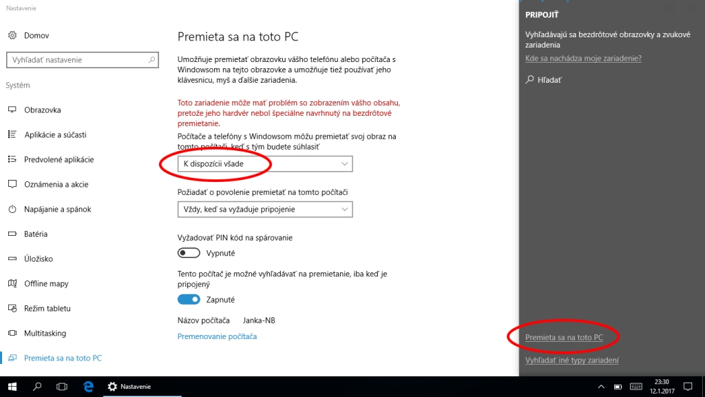 Miracast sa na Windows 10 používa nasledovne. Ak chcete na notebooku alebo desktope prijímať obraz z iného zariadenia, napríklad smartfónu či iného notebooku, vysuňte bočný panel Centra akcií a kliknite na ikonu Pripojiť. Následne vyberte možnosť „Premieta sa na toto PC“, ktorá otvorí relevantné nastavenie, kde môžete vybrať „K dispozícii všade“ alebo „K dispozícii na zabezpečených sieťach“.