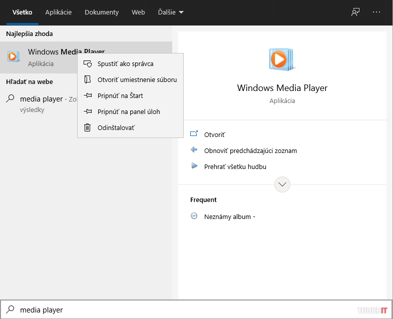 Druhý spôsob je nájsť prehrávač v ponuke Štart a kliknúť naň pravým tlačidlom. Zobrazí sa kontextové menu a položka Odinštalovať. Presmeruje vás na systémové okno Voliteľné funkcie, kde prehrávač nájdete a môžete ho odobrať. Takýmto spôsobom sa zbavíte všetkých nepotrebných súčastí v systéme.
