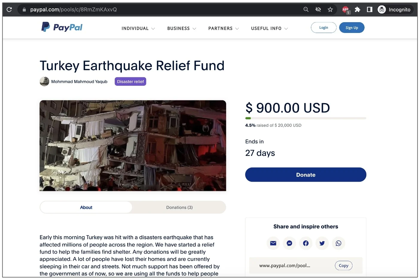 Ľudia znalí problematiky upozornili aj na to, že v Turecku PayPal od roku 2016 neposkytuje platobný styk. Aj toto bude znakom toho, že ide o podvod. Naproti tomu sú tu ale účty platformy Venmo, ktoré tiež deklarujú pomoc pri katastrofe a zbierajú peniaze.