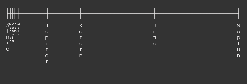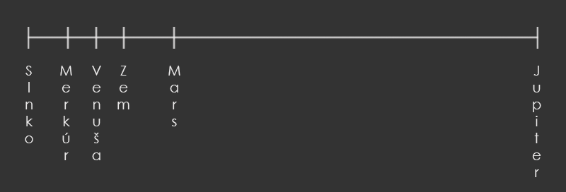 Lenže tak to nie je. Pozrime sa na rozstupy v správnom pomere (samozrejme na úkor toho, že čiarky reprezentujúce planéty a Slnko sú enormne nadrozmerné). Aj keď Venuša či Mars sú od Zeme desiatky miliónov kilometrov ďaleko, z pohľadu Jupitera sú všetky malé vnútorné planéty viac menej pri sebe.