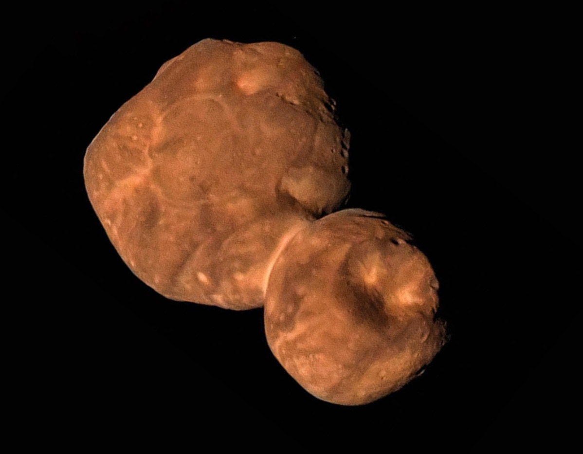 Fotografia Arrokothu, alias Ultima (väčšia časť) a Thule (menšia časť). Po tej dlhšej strane je veľký zhruba 36 km, takže na jeden koniec by sa dala umiestniť Bratislava a na druhý Trnava a boli by od seba tak ďaleko ako tu na Zemi /Foto: NASA/