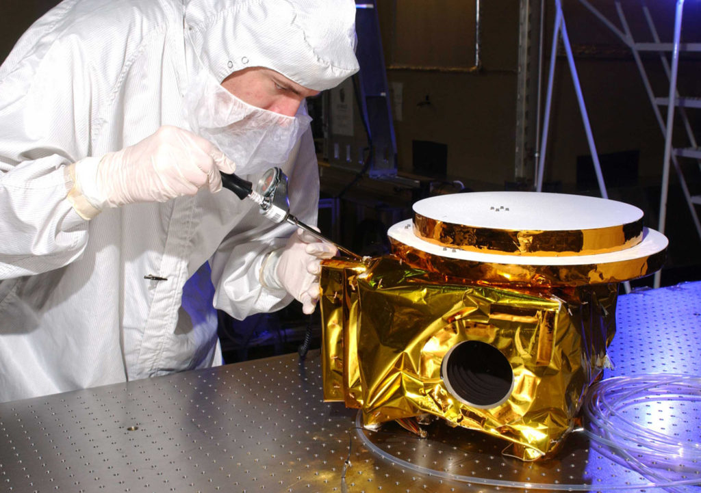 Fotoaparát Ralf sondy New Horizons. Čierny kruh vpredu je objektív. Tanier v hornej časti je regulátor tepla /Foto: NASA/