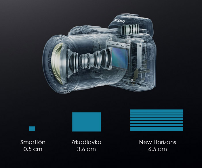 Veľkostné porovnanie obrazových CMOS/CCD čipov smartfónu, pokročilej zrkadlovky a kozmického fotoaparátu sondy New Horizons