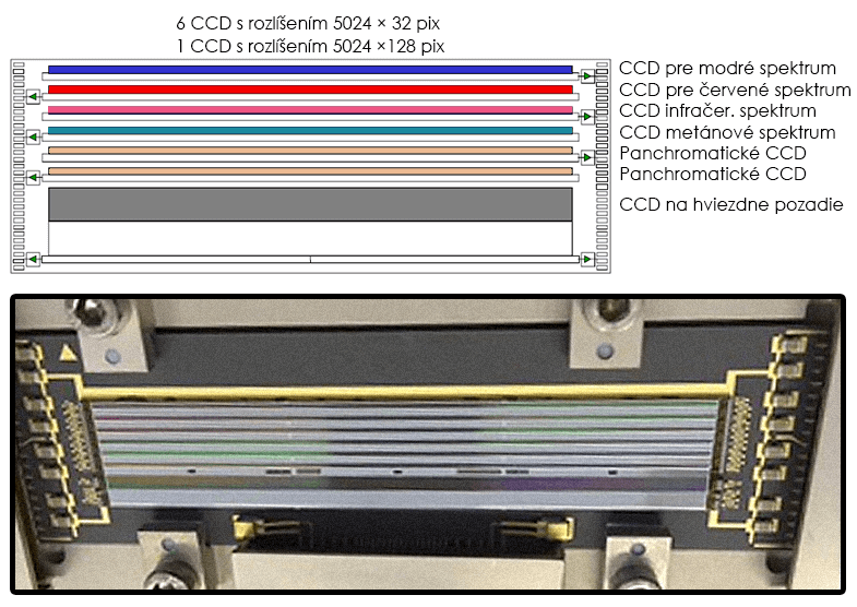 Na spodku obrázku čipov, respektíve svetelných senzorov sondy môžete ešte vidieť aj siedme najširšie CCD (5024 × 128 pixelov), ktoré sa používa na snímanie hviezdneho pozadia pre účely navigácie.