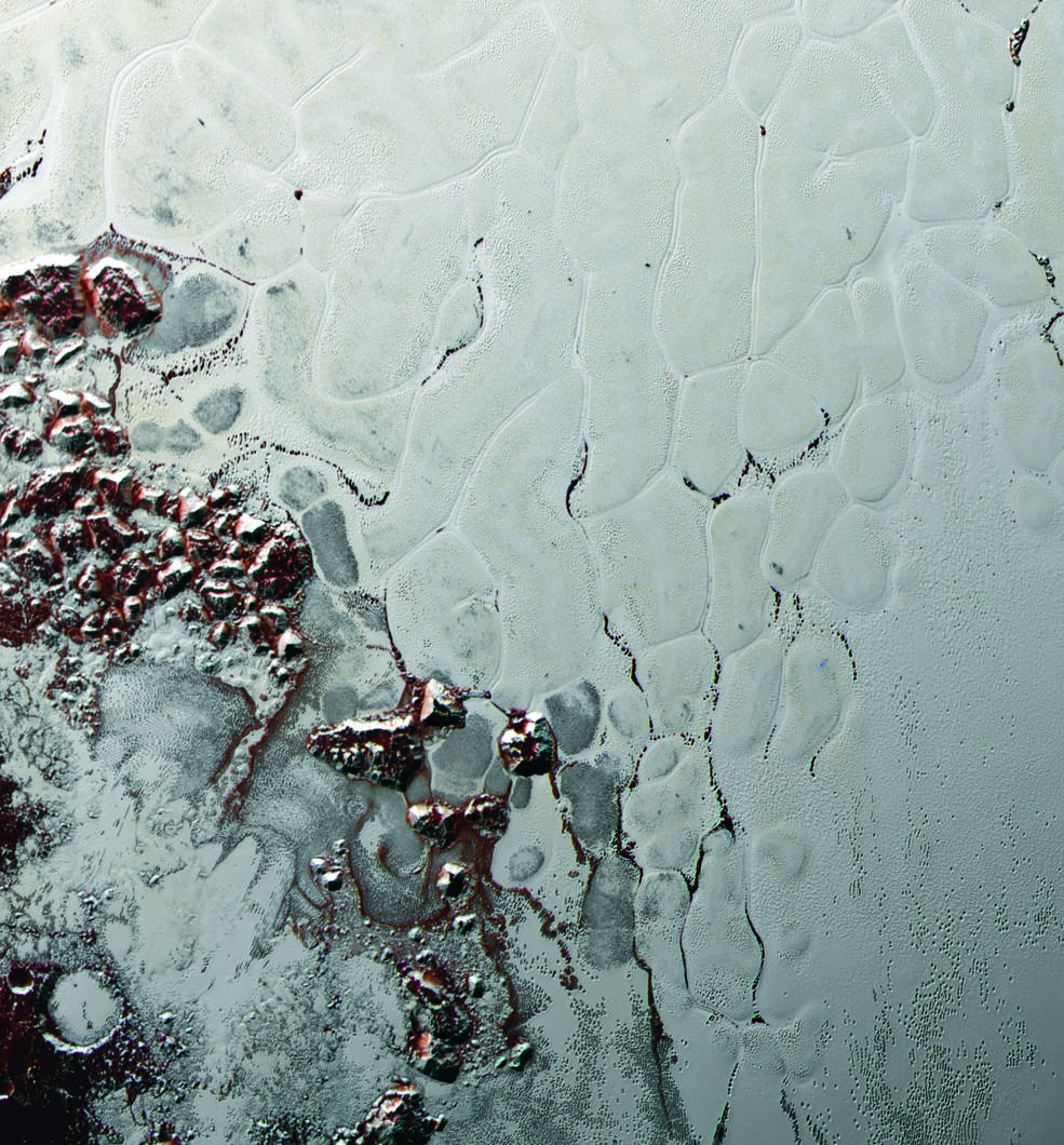 Výborná ukážka schopností kozmického fotoaparátu. Na tejto snímke vidíte detail povrchu Pluta, v šírke zhruba 400 km (cca celé Slovensko). Ide o ľadovcovú oblasť Sputnik Planitia, v rámci ktorej prazvláštne polygóny, väčšie ako hory Tatier (cca 10 km), prerážajú povrch a stúpajú cezeň ako bubliny. Červenú farbu by vaše oči nevideli. Je zachytená v infračervenej časti spektra a ide prakticky o únik interného tepla Pluta. To sa snaží uniknúť z pod ľadovca, čím dochádza k vytváraniu stúpajúcich a klesajúcich hôr dusíkového ľadu, ktoré prerážajú povrch a prepadajú sa do neho späť. Nič také inde v Slnečnej sústave neexistuje. /Foto: NASA/