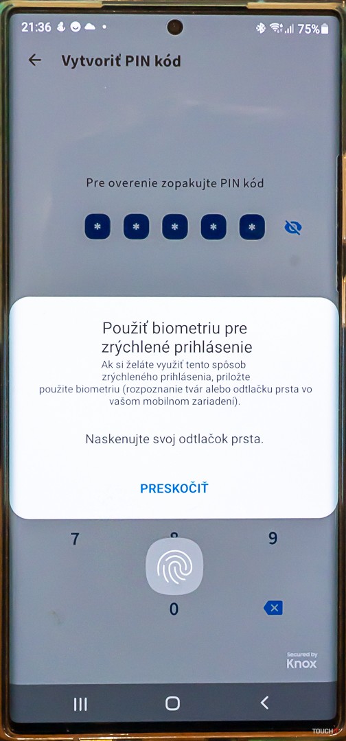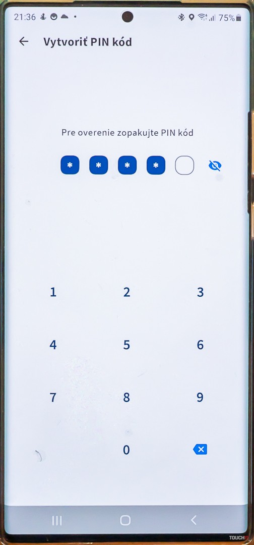 Nasleduje vytvorenie prístupového PINu. Ten musí obsahovať 5 číslic a v ďalšom kroku ho potvrdzujete. Ak máte na telefóne snímač odtlačku prsta, dá sa použiť na prístup do aplikácie aj ten. Je to rýchlejšie ako zadávanie PIN kódu.