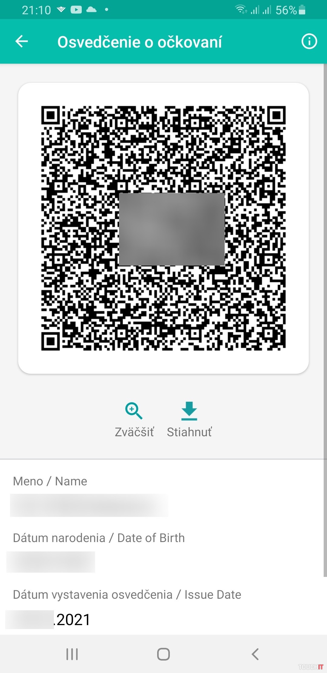 Aktualizácia 1 (1.7.2021): Za 24 hodín od vydania aplikácie si ju stiahlo pre operačný systém Android viac ako 50 používateľov. Apple počet stiahnutí zatiaľ nezverejnil. NCZI aj Slovensko IT riešia hlavne problém ako zjednodušiť proces získania prístupového kódu na stiahnutie preukazov. Súhlasíme, že je to pre bežných používateľov dosť komplikovaný proces. Aktualizácia 2 (2.7. 2021): NCZI od piatku posiela ľuďom mail aj s vygenerovaným prístupovým kódom k aplikácii GreenPass. Zároveň je tu aj link na stiahnutie tejto aplikácie z aplikačných obchodov Apple a Google. Problematicky sa totiž táto aplikácia v týchto obchodoch hľadá. Podľa vyjadrenia NCZI pre TOUCHIT boli tieto maily zaslané ľuďom, ktorí požiadali o predbežný certifikát. Má im pomôcť zorientovať sa pri inštalácii aplikácie a tiež pri stiahnutí certifikátov v prípade, že tak ešte neurobili. Toto výrazne urýchli vytvorenie Digitálneho COVID preukazu EU. Celý proces s QR kódmi môže vyriešiť aj vaša zdravotná poisťovňa. Podľa dohody ak má zdravotná poisťovňa informáciu o vašom očkovaní, potom ho zobrazí vo svojej mobilnej aplikácii. K 1. 7.2021 toto mala vyriešená len Všeobecná zdravotná poisťovňa. Na poisťovňu Dôvera a UNION ešte čakáme.