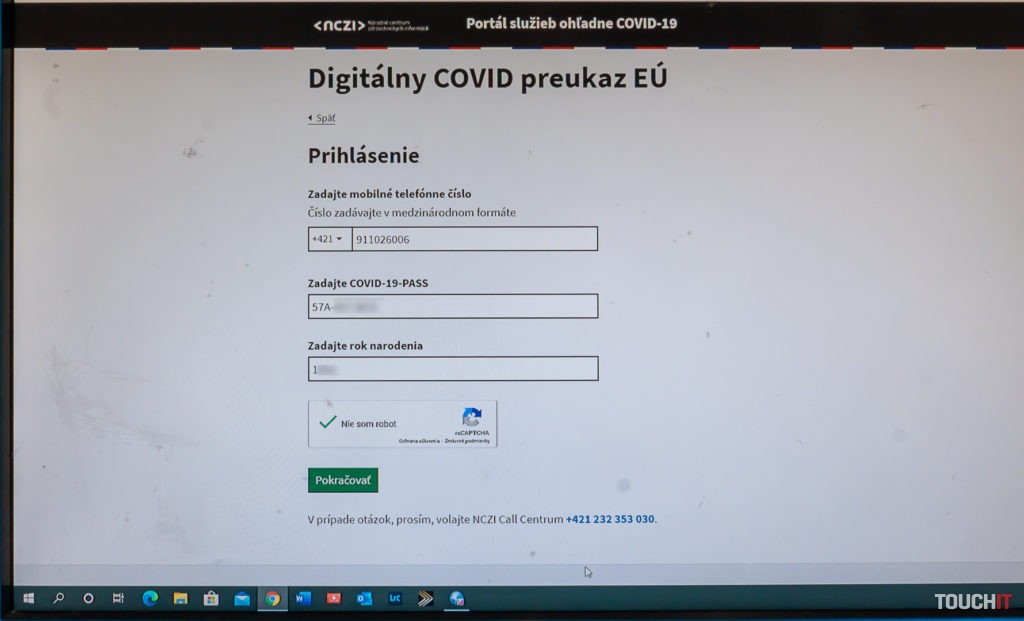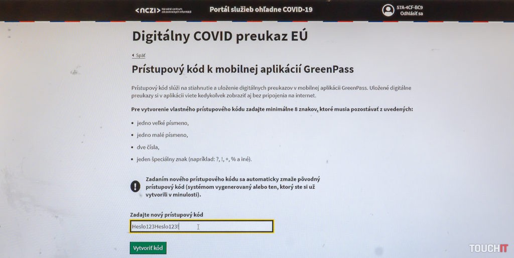 Opäť je tu presun od smartfónu k notebooku a na stránku korona.gov.sk. Kód získate v sekcii Získať Digitálny COVID prekaz EÚ. Prejdete vyššie definovaným spôsobom so zadaním telefónneho čísla, COVID-19 Passu a roku narodenia a tiež je tu overenie mobilného čísla. Teraz sa presuniete k položke Prístupový kód k mobilnej aplikácií GreenPass. Sem zadáte želaný prístupový kód, ktorý má obsahovať jedno veľké písmeno, jedno malé písmeno, dve čísla a jeden špeciálny znak. NCZI vyslovene uvádza, že príkladom špeciálneho znaku je aj „+“, ale nie je to pravda. Kód s týmto znakom systém zamietne. Po zadaní prístupového kódu sa opäť dostávate k možnosti uloženia preukazu do mobilu.