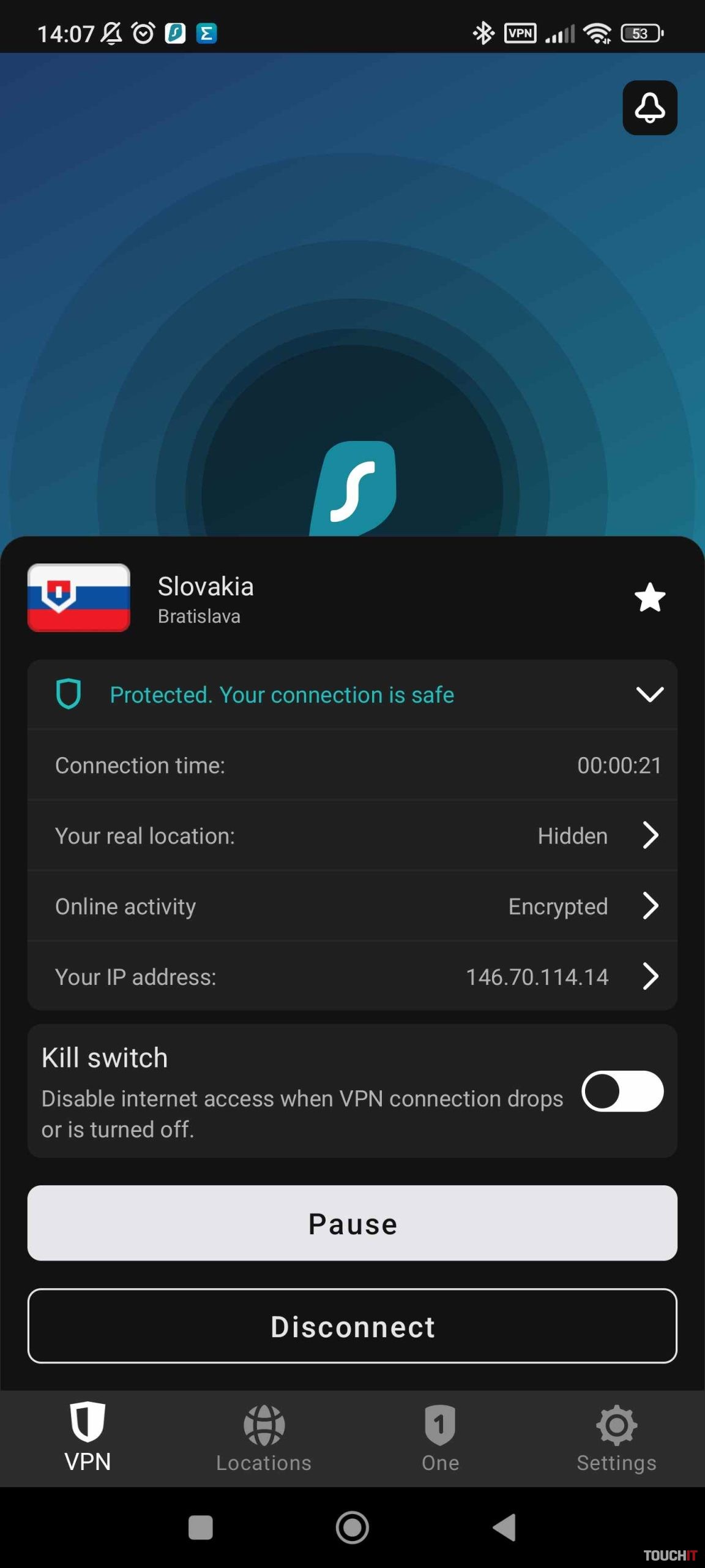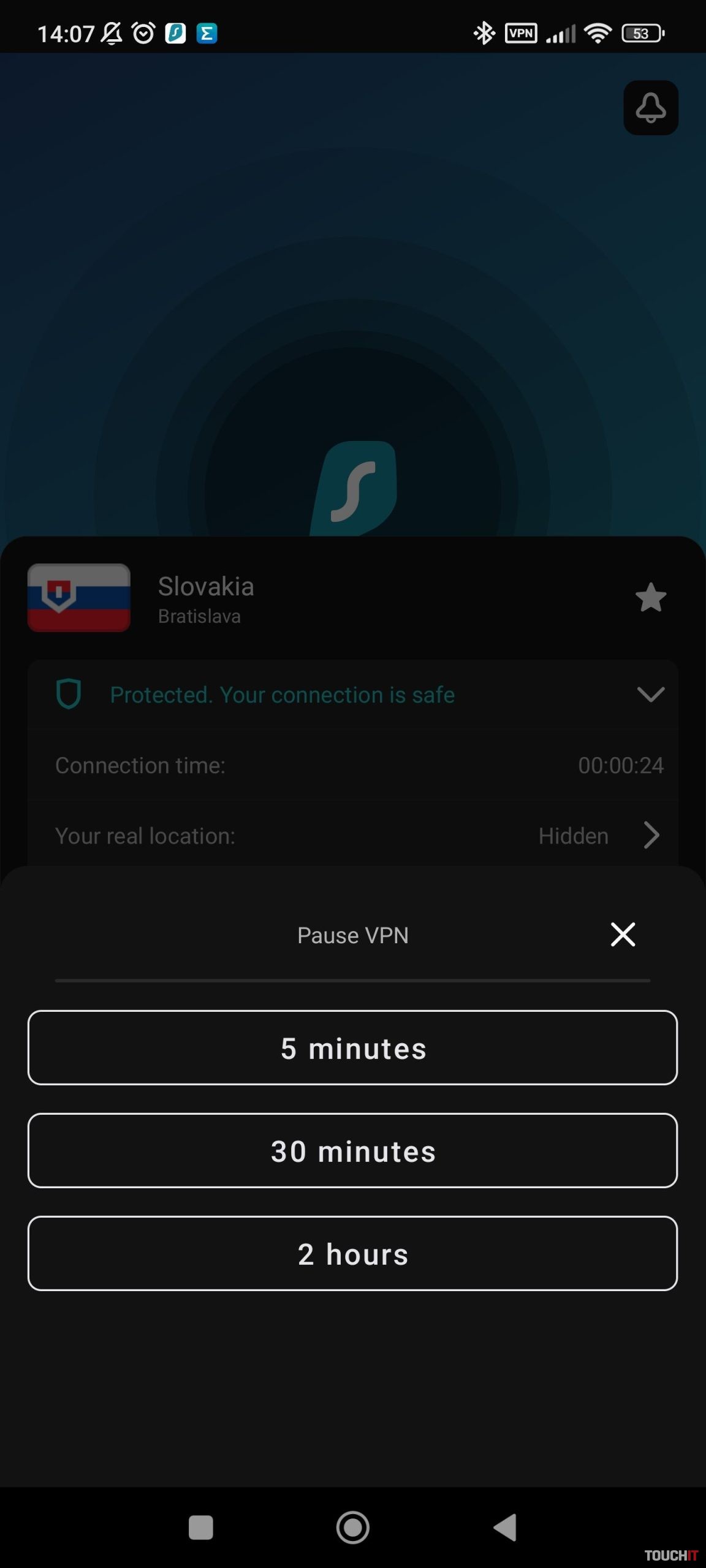 Sprevádzkovanie aplikácie nie je vôbec náročné a jej použitie je ešte jednoduchšie ako použitie väčšiny ostatných aplikácií. Stačí ju nainštalovať, zadať meno a heslo a vybrať si krajinu, do ktorej sa chcete pripojiť. V rámci možností, ktoré aplikácia poskytuje, je tu možnosť dočasne pozastaviť takéto pripojenie a zvoliť si pauzu na 5 alebo 30 minút či 2 hodiny. Následne sa VPN pripojenie automaticky obnoví.