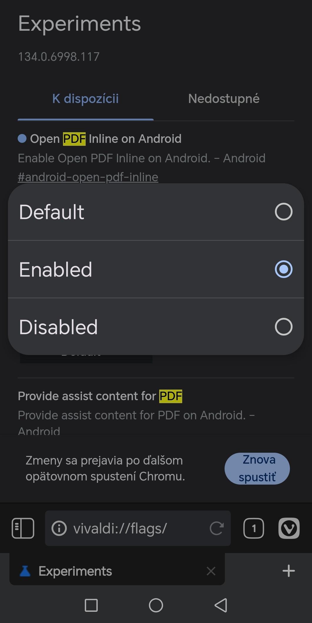 Vyhľadajte položku Open PDF Iinline on Android a zo štandardného nastavenia nazvaného Default vyberte Enabled.