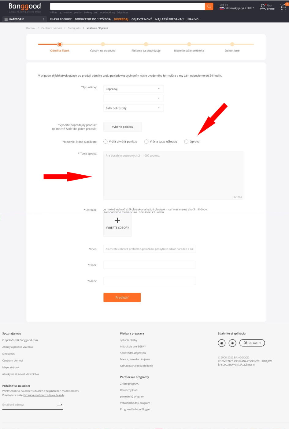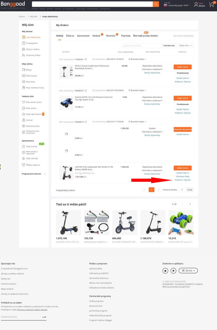 Na Banggoode, podobne ako na Aliexpresse a iných čínskych e-shopoch, máte v rámci svojho profilu podmenu so všetkými objednávkami, ktoré ste z obchodu realizovali. Stačí sa na stránke Banggood.com prihlásiť svojím používateľským menom a vybrať položku Moje objednávky. V nich je potrebné zvoliť výrobok, ktorý chceme reklamovať a kliknúť na možnosť Vrátenie/oprava. Tu len podotkneme, že menu je v slovenčine, aj keď niektoré výrazy sú preložené divne.
