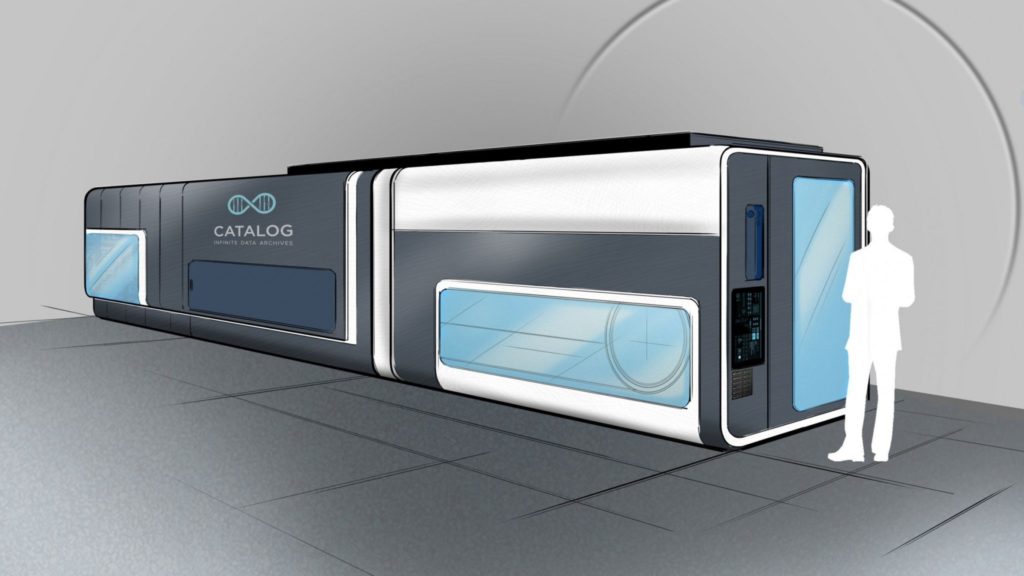Koncom júna tohto roku zaujal v problematike DNA úložísk nový startup Catalog, ktorý sa v demonštračnom videu pochválil sériovým strojom s veľkosťou skrine, ktorý je schopný syntetizovať gigabajty DNA v rýchlom slede behom jedného dňa. Jeho funkčnosť bola demonštrovaná na syntetizovaní 16 GB súboru skomprimovanej Wikipédie. Veľká rýchlosť  bola dosiahnutá tým, že namiesto unikátneho skladania DNA reťazca sa používal katalóg maličkej predvytvorenej DNA informácie (miniatúrnych reťazcov), z ktorých sa výsledné dáta skladali. DNA sa pritom vo forme malých kvapiek umiestňovala na rýchlo sa točiaci plastový pás, z ktorého sa následné kvapky po uschnutí ručne odstránili a zhutnili do jednej skúmavky. Stroj tak pripomína tlačiarensky pás, pri ktorom sa na rotujúcom papieri vytvorí akýkoľvek text formou odtláčania jednotlivých písmen abecedy. Aj keď to pôsobí zaujímavo a startup ohlásil, že cieľom je už v budúcom roku predstaviť stroj (vo veľkosti autobusu), ktorý dokáže syntetizovať 1 TB DNA dát za deň, treba byť skeptický. Startup nepublikoval žiadne vedecké dáta o svojich projektoch a nemáme ani potuchy, ako veľmi je jeho syntéza chybová a či je výsledné dáta vôbec možné uspokojivo čítať. Korekcia chýb v reálnom čase a náhodný prístup k dátam takmer určite chýba a ide o skôr test surovej (skoro)syntézy. Prezentácia startupu pôsobí ako „reklama“ a nepoznáme žiadne detaily o skutočnej úspešnosti procesu. Tento projekt sa tak veľmi ťažko hodnotí v reálnom svetle. V súčasnosti je nutné byť pred výsledkami tohto typu na pozore, pretože startupy tvrdiace „veľké veci“ bez hmatateľného dôkazu a bez vedeckých publikácii tu už boli a dopadli aj napriek veľkým investíciám vskutku neslávne. Naposledy to bol veľkohubý miliardový biotechnologický startup Theranos, ktorý sa ukázal ako podvod.
