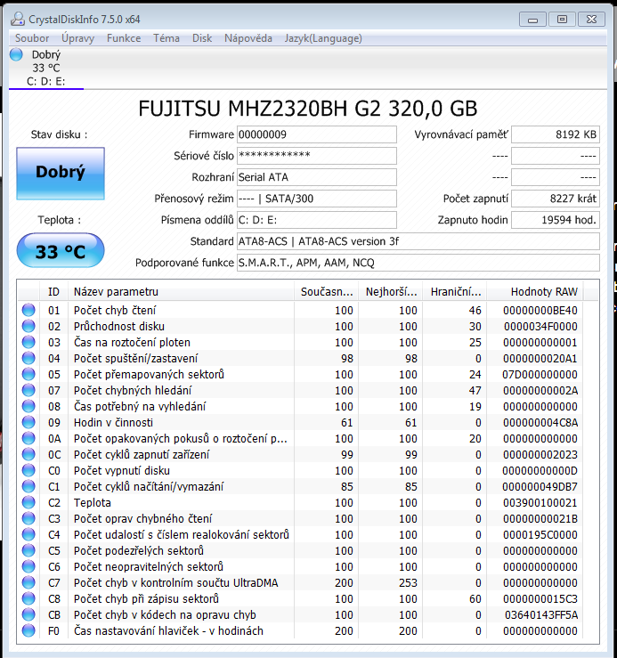 Najviac vypovedajúce položky v podobe C5 (počet podozrivých sektorov) a C7 (neopraviteľných sektorov) majú nulovú hodnotu. Rovnako sa váš disk ani nikdy nemusel pokúšať opakovane roztočiť, takže prvý pokus vždy dopadol dobre (0A). Stav vášho disku je teda programom oprávnene označený ako „Dobrý“.