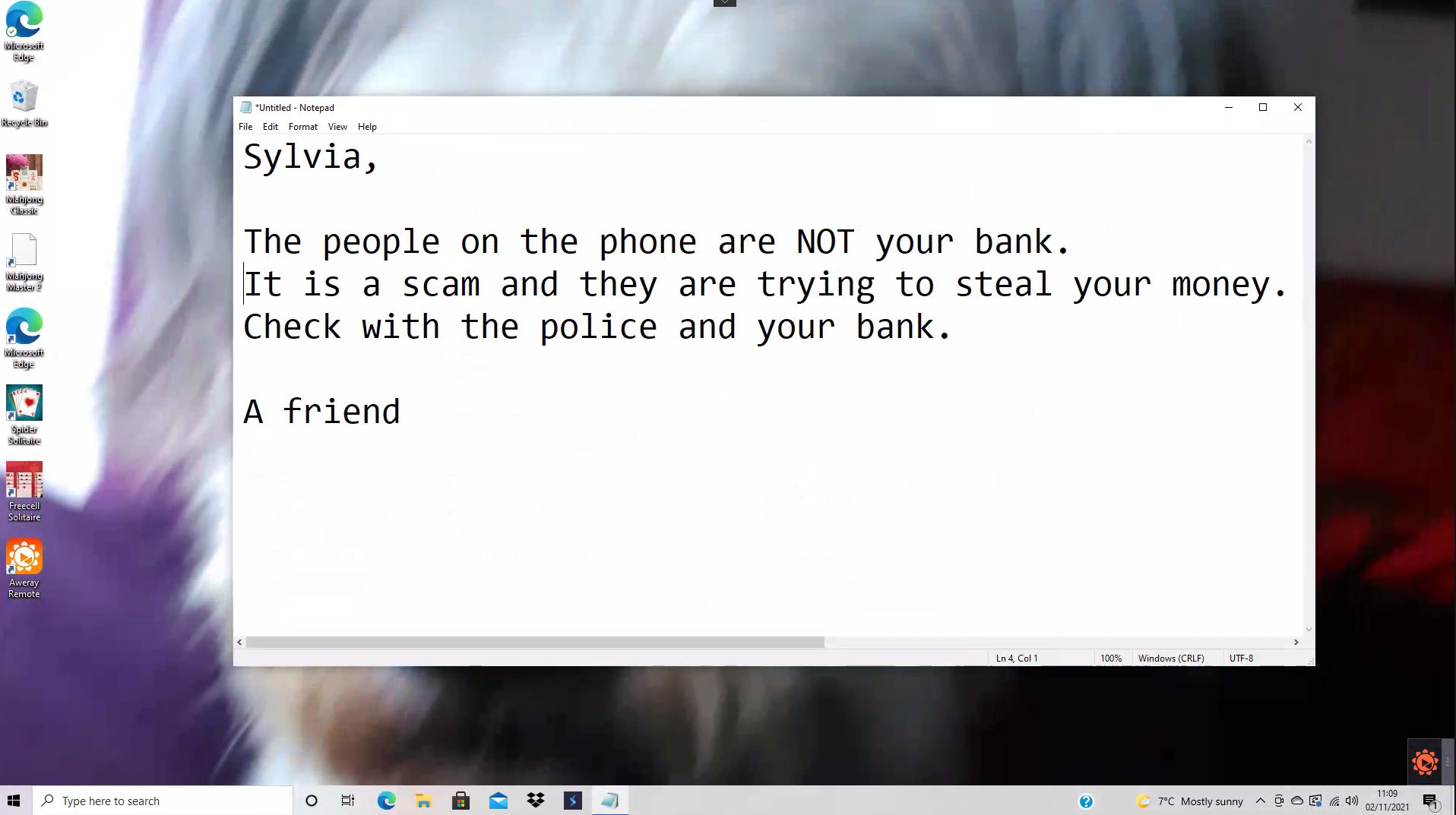 Svedomitejší podvodníci skrátka v takýchto momentoch odhalili svoje úmysly napríklad tým, že do Poznámkového bloku na monitore počítača obete napísali, že ide o podvod a s počítačom je všetko v poriadku, pričom inštruovali obeť aby povedala do telefónu, že nemá záujem a položila, pretože hovor bol monitorovaný majiteľmi call centra.