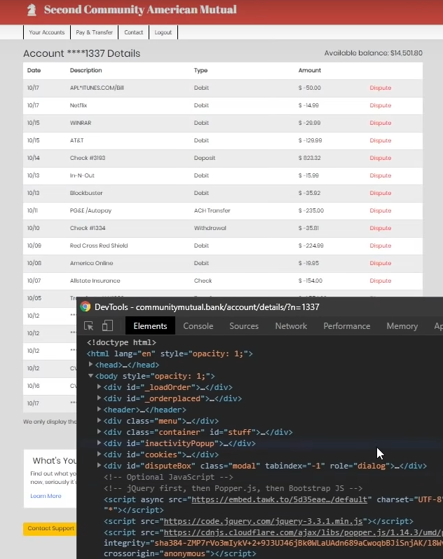 Následne stlačí kláves F12 a v internetovom prehliadači otvorí vývojárske nástroje, pričom ručne prepíše na otvorenej stránke text transakcie, aby to vyzeralo, že je napr. od Microsoftu, pričom zároveň ručne prepíše sumu sporiaceho účtu, aby vyzerala nezmenená.