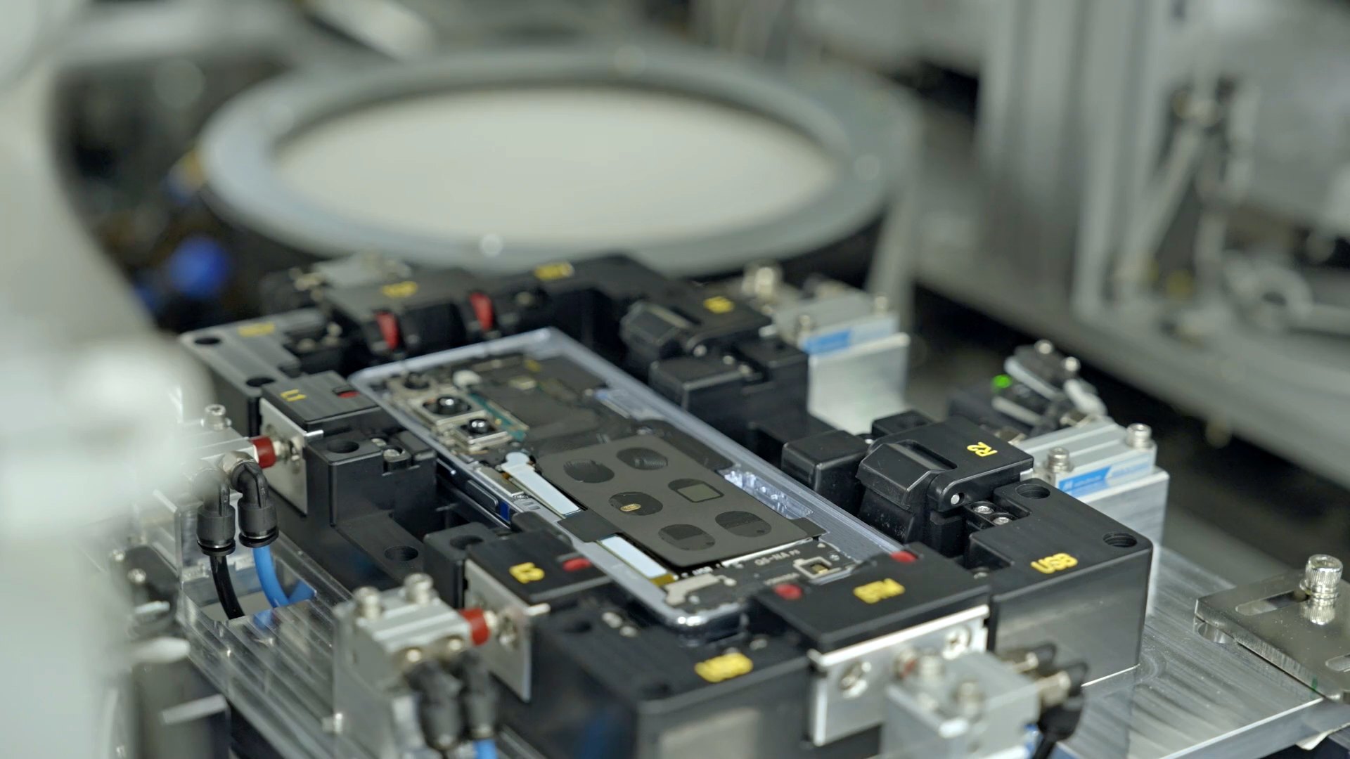 Prvá časť výrobného pásu slúži na skonštruovanie telefónu – robot nakreslí na plošný spoj príslušné prepojenia a plošný spoj sa pripraví na osadenie súčiastok. Súčiastky prichádzajú nalepené na plastových kotúčoch. Postupujú do stroja a ten ich osadzuje na presné miesto. Presnosť je tak veľká, že je možné takto osadiť všetky súčiastky smartfónu. Pritom sa osadzované miesto krátko osvetľuje a robot vkladá príslušnú súčiastku do vyvŕtaných dier. Na automatizovanej linke sa takto osadzovali aj veľké súčiastky ako sú napr. kamery alebo prepojovacie konektory.
