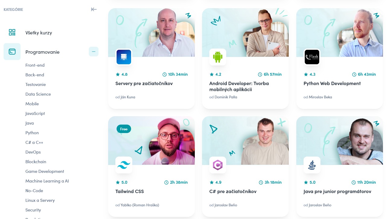 Táto platforma disponuje elegantným a prehľadným rozhraním, ktoré sa vyhýba zbytočným rušivým elementom, poskytujúc tak používateľovi čistý a ľahko ovládateľný priestor. Každý kurz je jasne charakterizovaný s informáciami o jeho trvaní, počte kapitol a jeho určení (či je vhodný pre začiatočníkov alebo pokročilých).