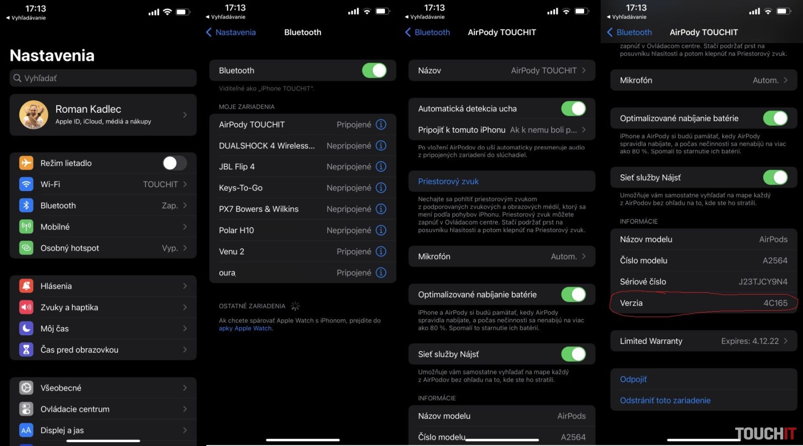 Čiže vy iba môžete čakať, až sa vám slúchadlá automaticky zaktualizujú. Manuálne môžete spraviť iba jednu vec a to je, že si skontrolujete aktuálny firmvér vašich slúchadiel. Pripojte slúchadlá k iOS zariadeniu, ťuknite na Nastavenia > Bluetooth > AirPods a v spodnej časti obrazovky s informáciami o slúchadlách si skontrolujte verziu vašich slúchadiel.