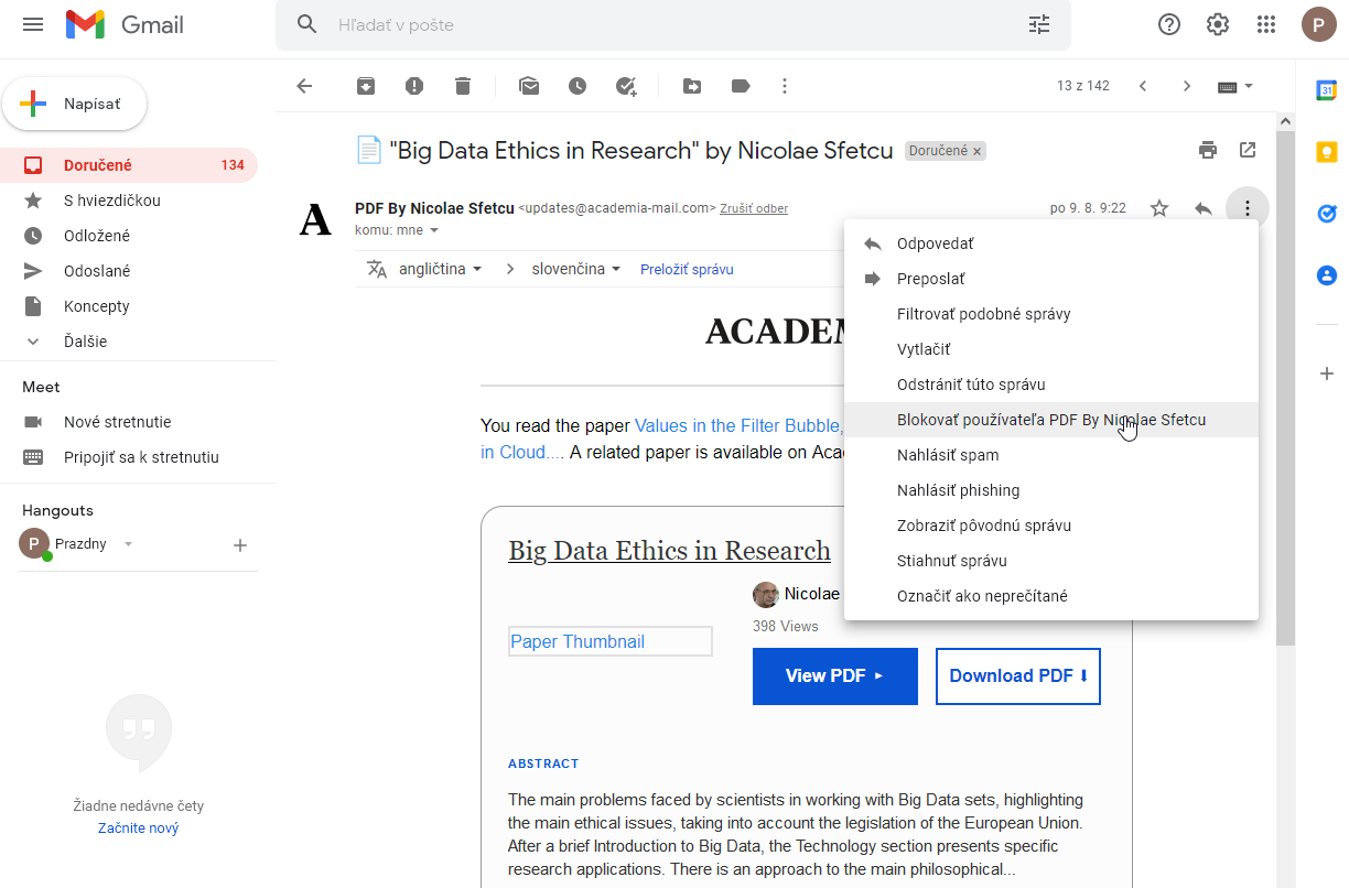 Prvou možnosťou je, že v rámci Gmailu otvoríte ktorýkoľvek obťažujúci e-mail. Na riadku, v ktorom vidíte meno a adresu dotyčného kliknite v pravej časti obrazovky na ikonu troch zvislých bodiek a z vysunutého zoznamu kliknite na možnosť „Blokovať používateľa“.