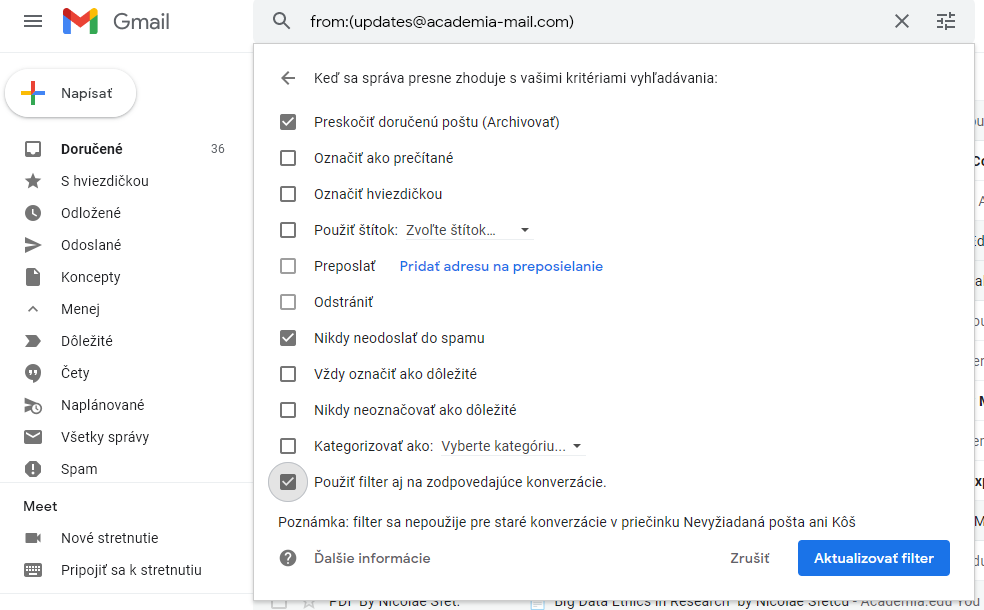 V ňom síce máte možnosť nastaviť, aby všetky odfiltrované e-maily boli zmazávané, ale oveľa vhodnejším riešením je, aby ste dané e-maily nejaký čas archivovali z bezpečnostných dôvodov. Zaškrtnite teda políčko „Preskočiť doručenú poštu – archivovať“ a zároveň zaškrtnite aj možnosť „Použiť filter aj na zodpovedajúce konverzácie“, aby sa pravidlá aplikovali aj na už prijaté e-maily.