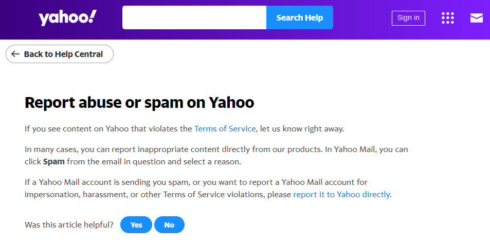 Navštívte sekciu pomocníka služby na adrese https://my.help.yahoo.com/kb/SLN26401.html, kde sa jasne uvádza, že ak sa nejaký Yahoo e-mail používa na „odosielanie spamu, vydávanie sa za cudziu osobu, obťažovanie, alebo iné porušovanie podmienok služby“, máte ho firme okamžite nahlásiť, kliknutím na daný odkaz pre formulár.