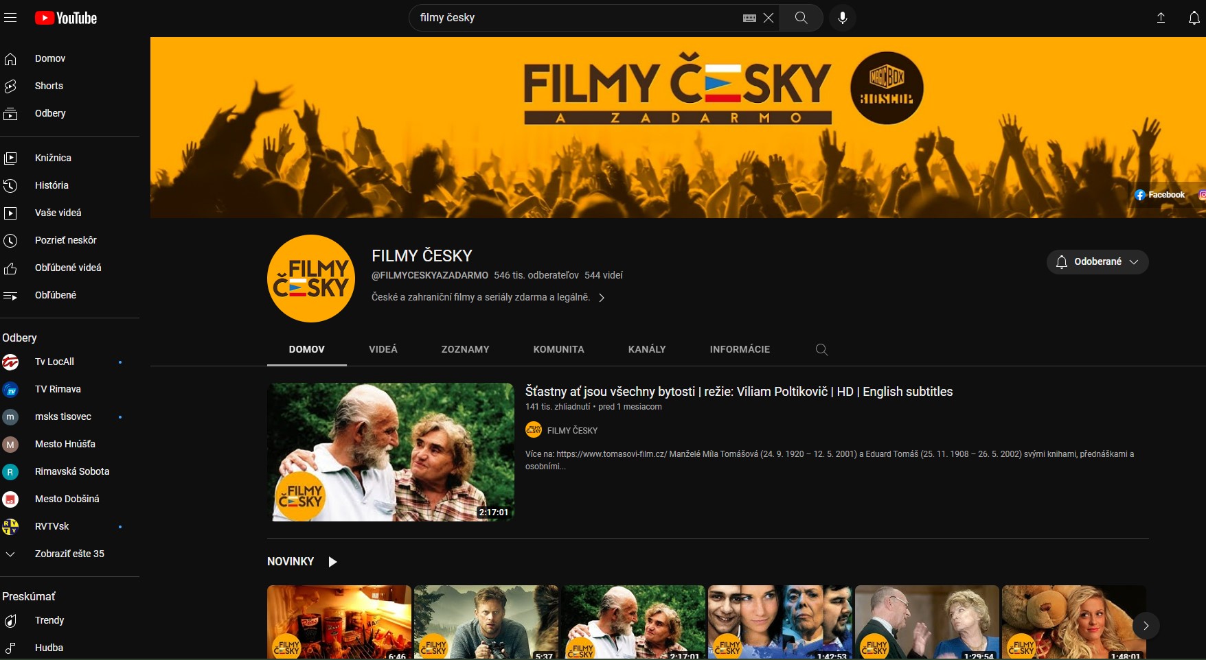 Alternatívou pre nás jazykovo menej zdatných je kanál Filmy česky. V tomto prípade nepotrebujete žiadne VPN, stránka je voľne prístupná z našej krajiny. Nájdete tu nielen veľa filmov, ale i dokumentov, samozrejme, v nám zrozumiteľnej češtine.