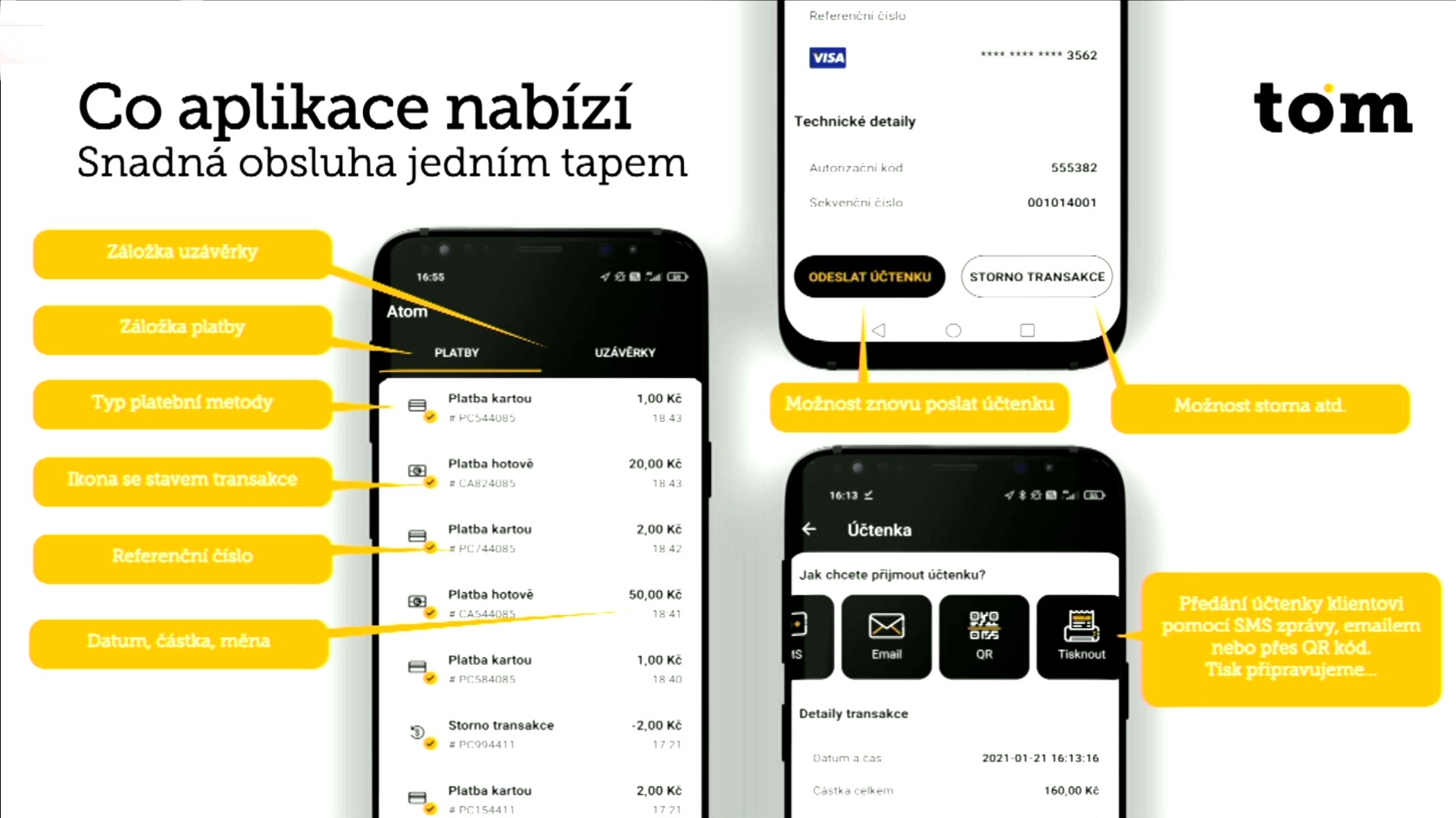 Mobilná aplikácia s názov GP tom funguje na všetkých telefónoch s operačným systémom Android 8 a vyšším a s NFC čipom. Platby kartami môžu obchodníci prijímať kdekoľvek, kde je signál internetu. Ak zákazník potrebuje o platbe doklad, môže si ho nechať odoslať cez SMS, emailom alebo priamo do mobilu načítať cez QR kód. Riešenie je vhodné napr. pre taxikárov, kuriérov, trhovníkov, remeselníkov, lekárov či menšie predajne. Ďalšími výhodami sú rýchlosť a jednoduchosť. [mobile_app_icons androidurl=“https://play.google.com/store/apps/details?id=com.globalpayments.atom“ appleurl=““][/mobile_app_icons] Obchodník môže pritom začať prijímať karty v priebehu niekoľkých hodín od podpisu zmluvy a môžete ich mať nainštalované aj na tisícke telefónov (napr. kuriérne spoločnosti). Aplikáciu je možné doplniť aj o pokladničné systémy, čo ocenia najmä sezónni podnikatelia, ktorí si už nebudú musieť kupovať žiadne ďalšie zariadenia. Obchodník tiež priamo vo svojom telefóne uvidí prehľad a históriu všetkých transakcií.