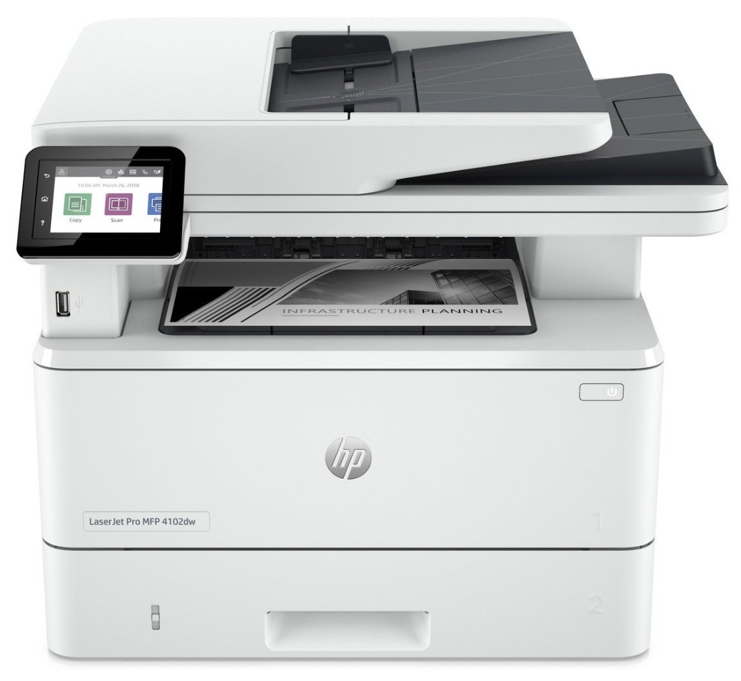 HP LaserJet Pro 4102dw – MFP na čiernobielu tlač s tankovým systémom, obojstranná tlač, Wi-Fi, LAN, automatický podávač dokumentov na skenovanie. Cena: 349 eur.