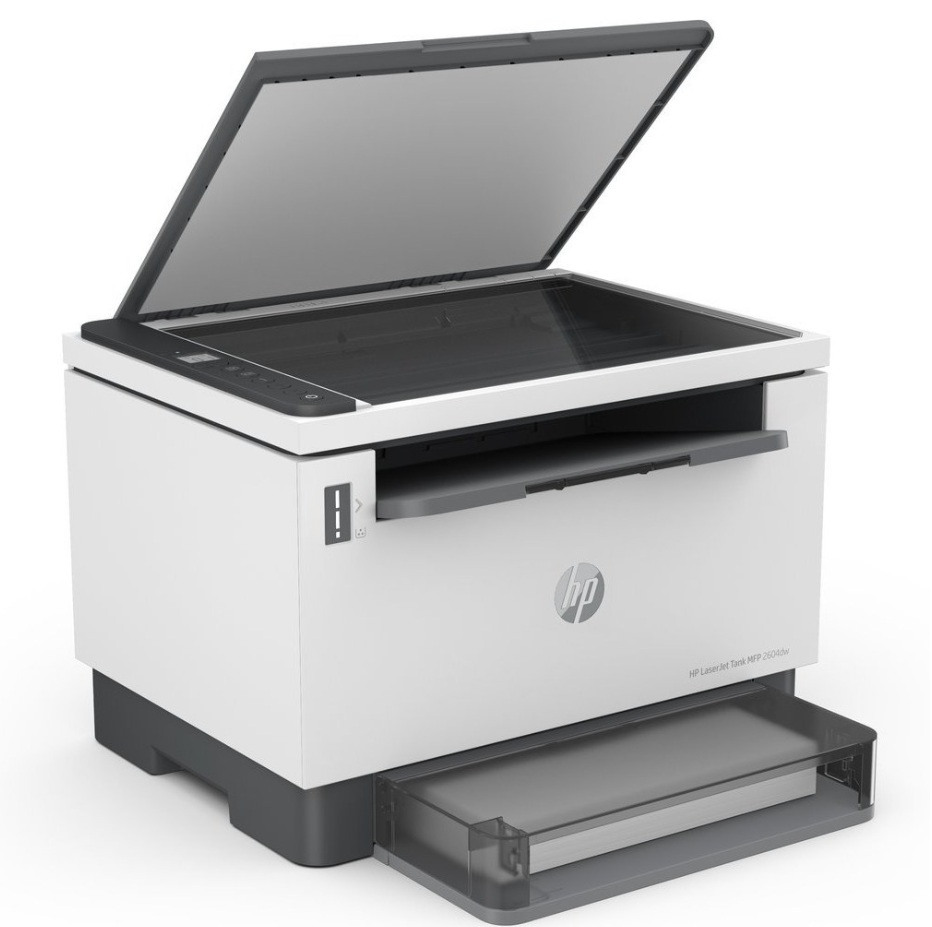 HP LaserJet Tank 2604dw – Laserová tanková multifunkcia na čiernobielu tlač, obojstranná tlač, plochý skener. Prepojenie cez Wi-Fi, LAN, USB. Odporúčané zaťaženie do 2500 strán mesačne. Cena: 295,70 eura
