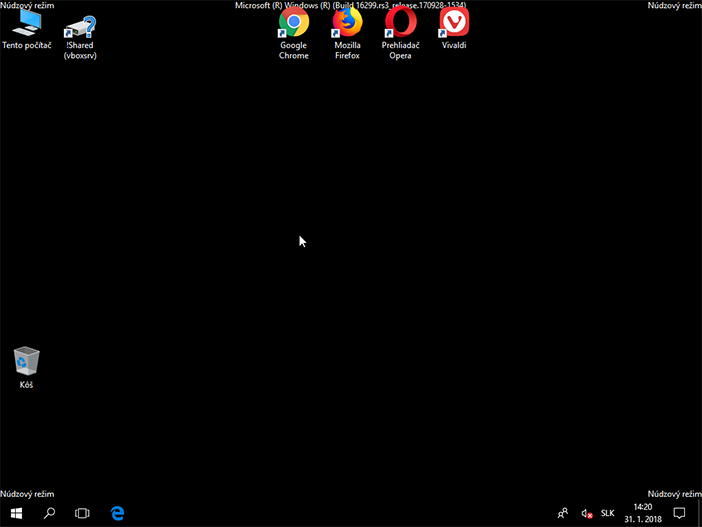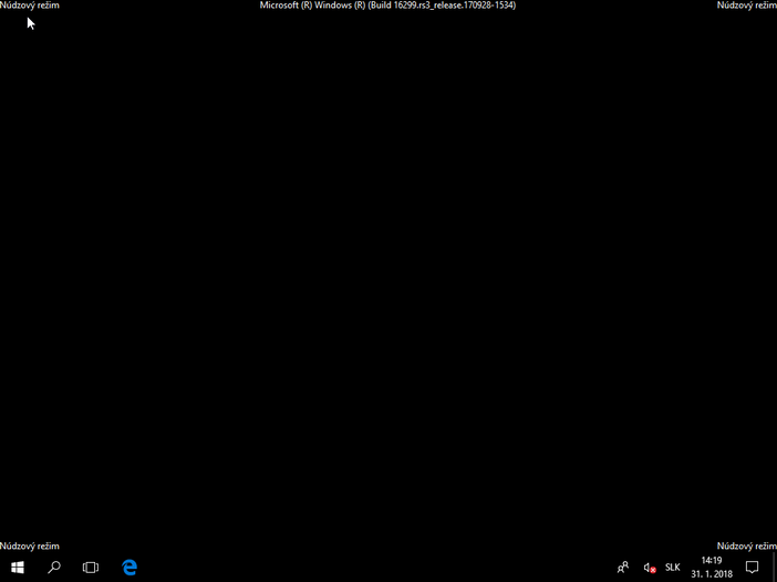 Spustený Núdzový režim Windows sa nedá prehliadnuť ani s ničím zameniť. Tapeta plochy sa nenačíta a namiesto neho sa zobrazí čierne pozadie, s nápisom Núdzový režim (Safe Mode) v štyroch rohoch. Na hornom okraji obrazovky nájdete informácie o aktuálnom zostavení Windows.