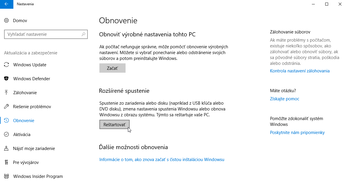 Alternatívou je otvorenie Nastavenia, kde v sekcii Aktualizácia a zabezpečenie otvoríte položku Obnovenie a v ponuke Rozšírené spustenie kliknete na tlačidlo Reštartovať.