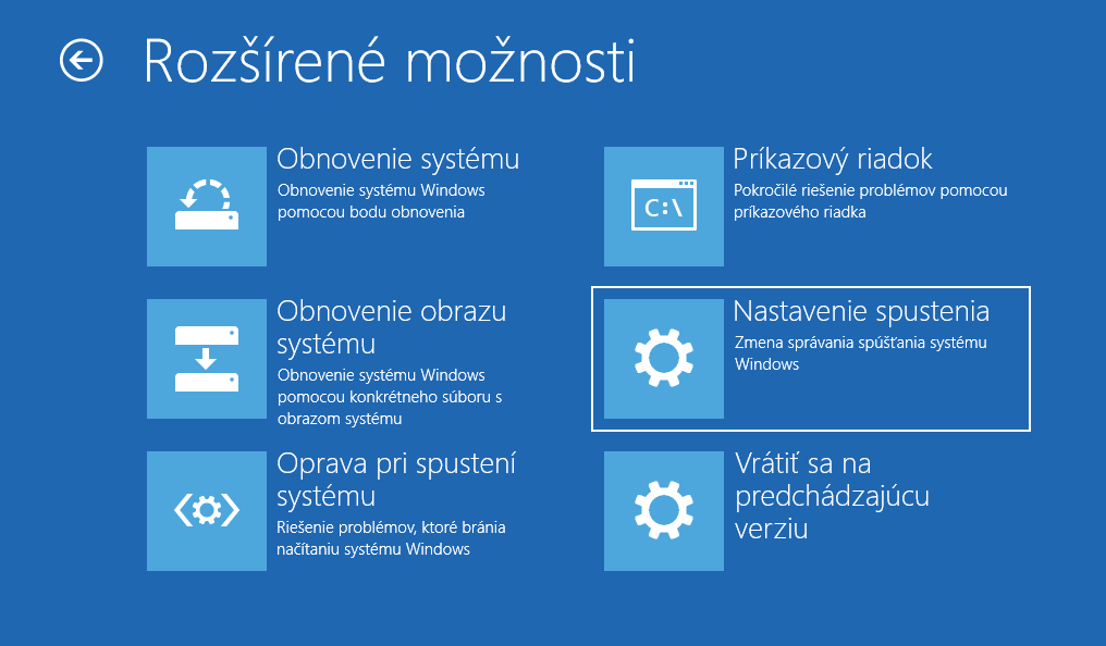 V tomto dlaždicovom grafickom rozhraní je potrebné vybrať možnosť Riešiť problémy, následne Rozšírené možnosti a napokon Nastavenie spustenia. Tu stlačte tlačidlo Reštartovať, ktoré vyvolá ponuku s možnosťami nábehu systému, kde Núdzový režim spustíte klávesom F4.