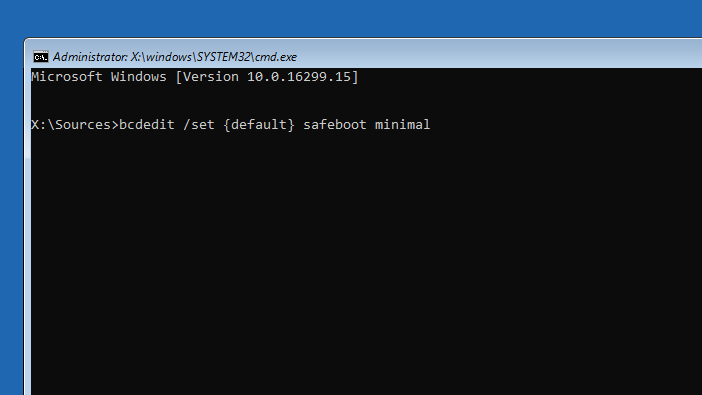 bcdedit /set {default} safeboot minimal