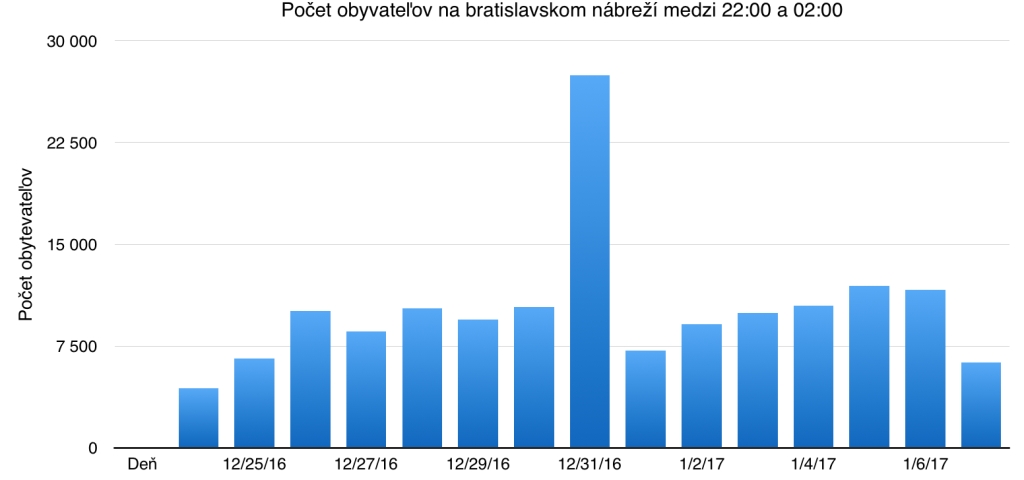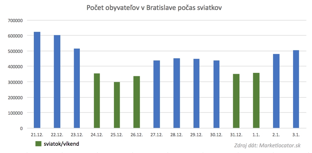 Štatistika prítomnosti mobilných zariadení v Bratislave v dňoch 21.12.2016 až 3.1.2017 odkrýva zaujímavé zistenia. Ešte 21. decembra sa z Bratislavy a priľahlých mestských častí hlásilo viac ako 600-tisíc ľudí. Na Štedrý deň, teda 24. decembra, to bola sotva polovica, niečo nad 350-tisíc obyvateľov. Absolútne minimum bolo v štatistikách zachytené 25. decembra – z pôvodných viac ako 600-tisíc ľudí v Bratislave a okolí zostalo menej než 300-tisíc.