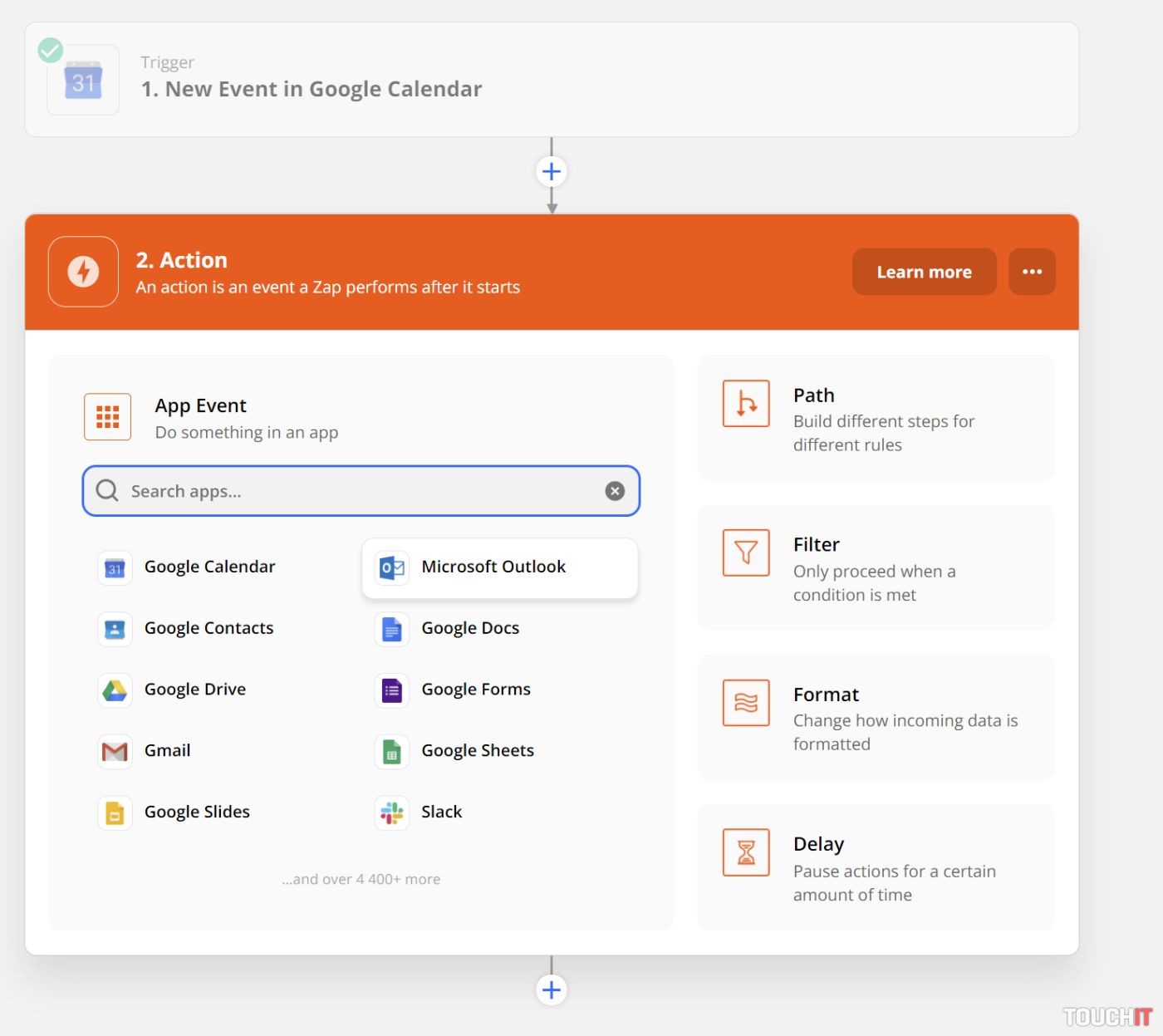 Po vytvorení konta v službe Zapier ťuknite na položku Zaps a následne vytvorte nové pravidlo automatizácie cez Create Zap. V prvom kroku je treba zvoliť pravidlo, ktoré bude aktivovať automatizáciu – ak chcete synchronizovať udalosti z Google kalendára do Outlooku, zvoľte Google kalendár. V opačnom prípade zvoľte Outlook.