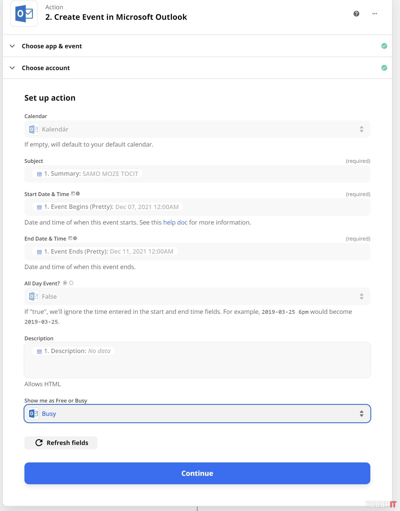 Pokračujeme výberom akcie. V mojom prípade to bolo vytvorenie udalosti v Outlook kalendári. Opäť si treba vybrať službu (Outlook) a kalendár v rámci Outlooku, ktorého sa bude automatizácia týkať. Následne si zvoľte akciu – u mňa to bolo vytvorenie novej udalosti, pričom som si nastavil, aby sa skopírovali kľúčové parametre udalosti z Google kalendára.