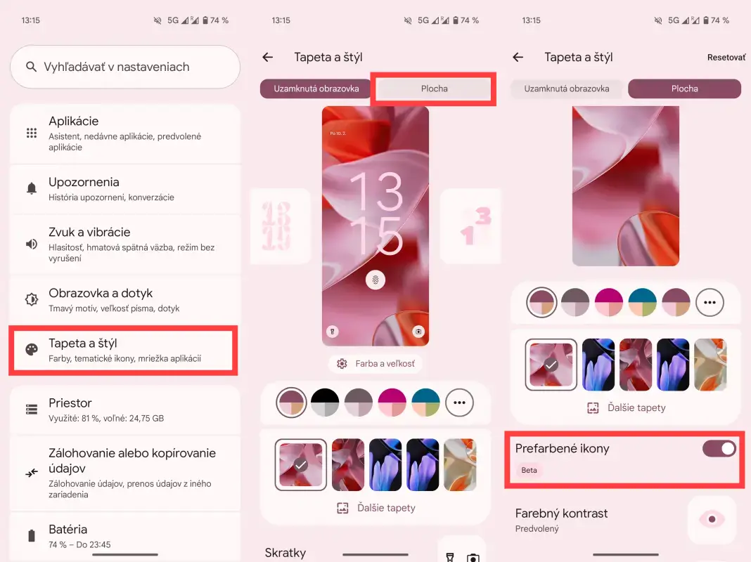 Prefarbené ikony si nastavíte v nastaveniach smartfónu v sekcii Tapeta a štýl. V rovnakej sekcii si viete prispôsobiť napríklad uzamknutú obrazovku, tapetu domovskej obrazovky či farebný kontrast textu, tlačidiel aj ikon. Ikony si prefarbíte nasledovným postupom.
