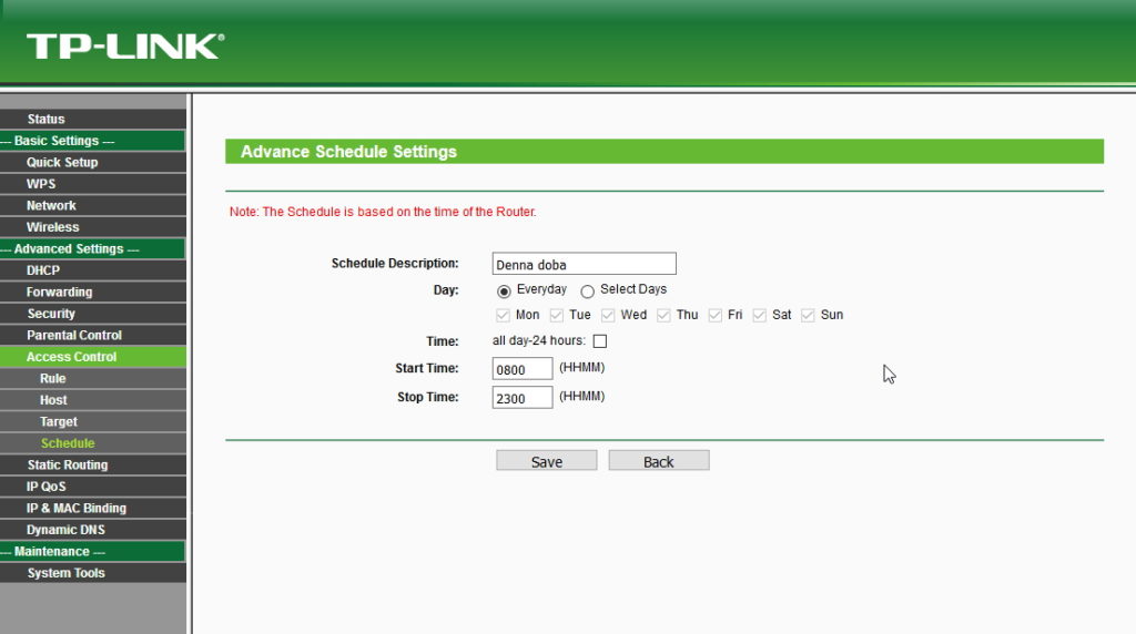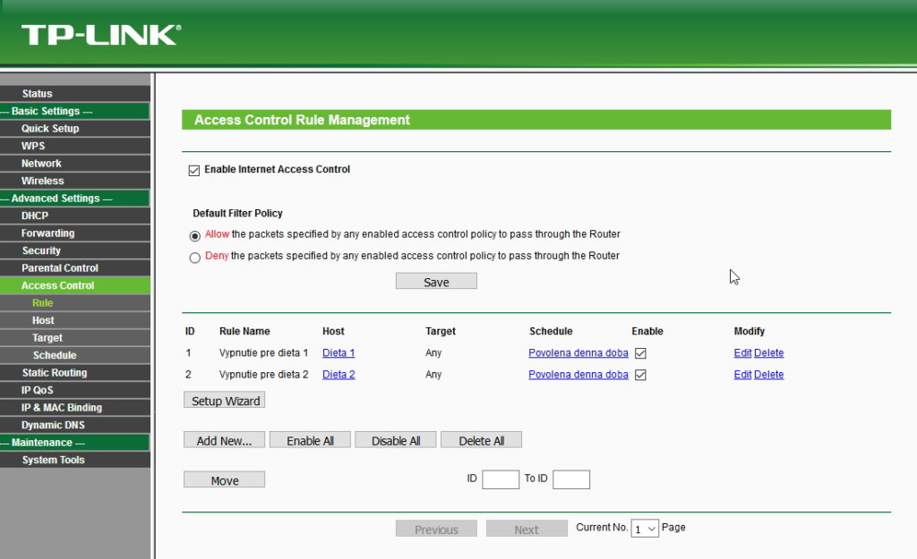 Nastavenie nájdete v rámci rozhrania TP-Link v sekcii Access Control/Schedule. Tu zadáte rozpätie 08:00 až 23:00 a povolíte ho na všetky dni (Everyday). Toto rozpätie nazvete napríklad ako – Povolená denná doba. Následne potrebujete zistiť MAC adresy zariadení, na ktoré nastavenie chcete uplatniť. Uvidíte ich v rámci rozhrania routeru napríklad prekliknutím na sekciu štatistiky bezdrôtového spojenia (Wireless/Statistics). Ide o číselný údaj vo formáte 00-00-00-00-00-00 (čísla a písmená A až F).