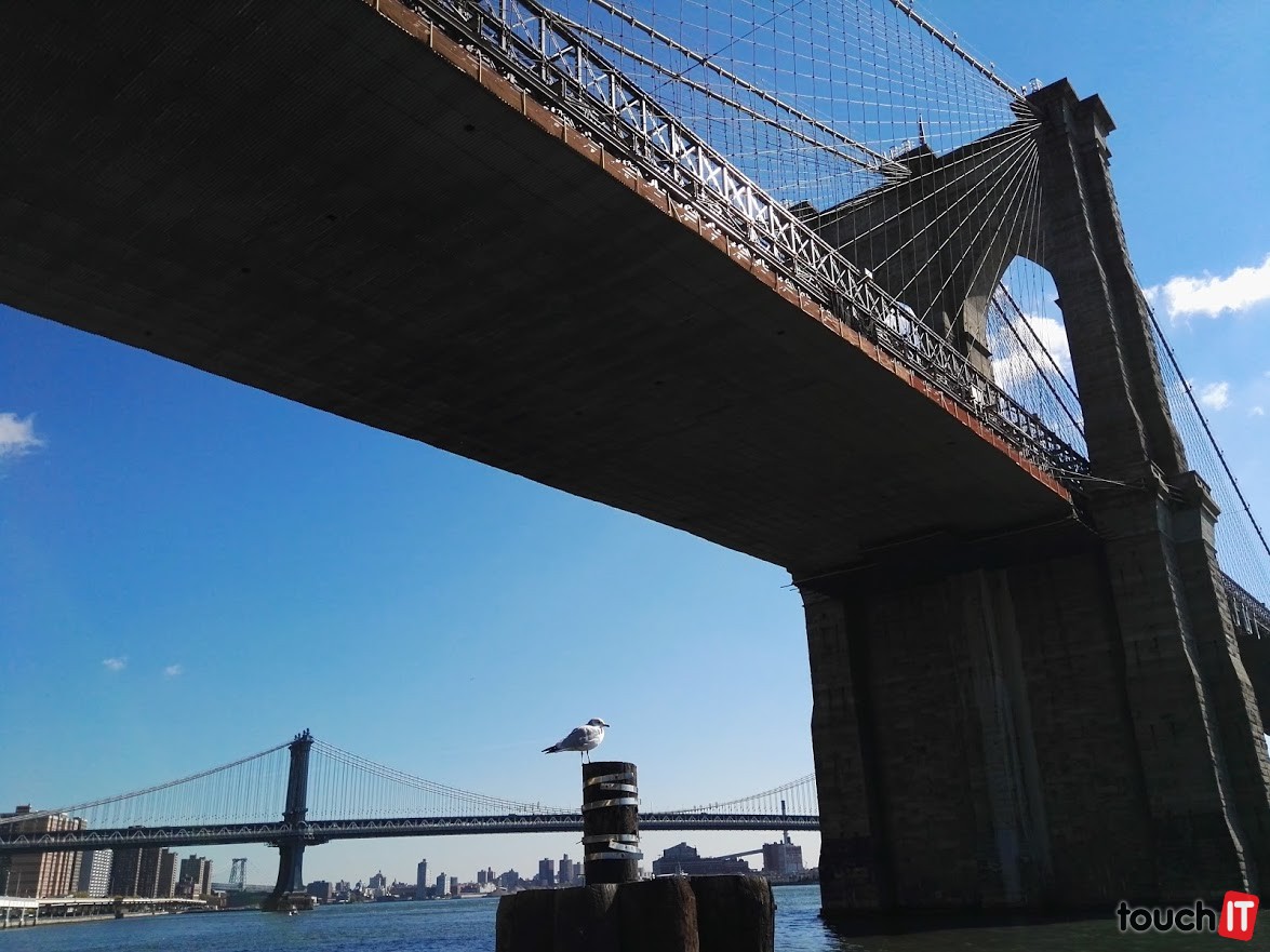Pod Brooklynskym mostom. Mimochodom, na moste kúpite magnetky a kľúčenky za najlepšie ceny v New Yorku. Výborná je aj ich variabilita (Fotené s Huawei P8)
