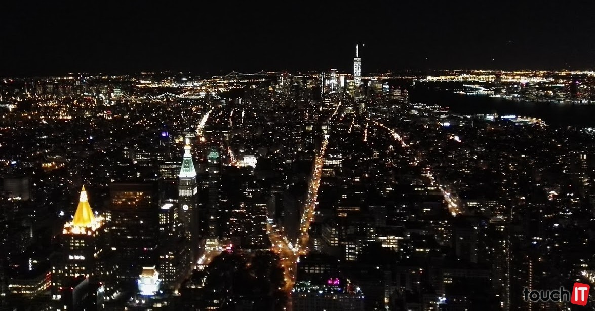 Pohľad na nočný New York z Empire State Building je výborný zážitok, ktorý nezachytí žiaden fotoaparát. Najvyššia budova v pozadí je Freedom Tower, ktorá nahradila padnuté dvojičky WTC (Fotené s Huawei P8)
