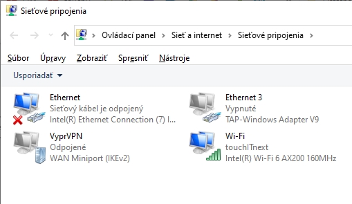 Pozor na to, ak sa objavia aj TAP adaptéry (Test Anything Protocol). Najčastejšie slúžia na pripojenie VPN a nie je chyba, že sú vypnuté. Ich použitie je viazané na program, ktorý ich vytvoril alebo funkciu v systéme, ktorá sa cez tieto adaptéry pripája.