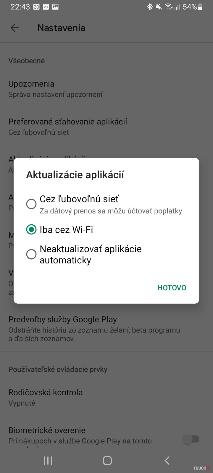 Štandardne sa aplikácie aktualizujú automaticky vždy pri spojení telefónu s nejakou Wi-Fi sieťou.
