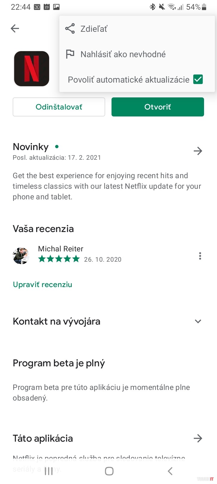 Nie všetci ale máme rýchle Wi-Fi pripojenie a tak je pre niekoho najlepšie aktualizovať aplikácie postupne, len tie, ktoré chce. A to najmä v čase, kedy chce. Občas sa totiž spustia aktualizácie v tú najnevhodnejšiu dobu. Aspoň trochu sa podarilo nakešovať video z YouTube a do toho sa spustí aktualizácia niekoľkých aplikácií. Tomuto procesu sa dá vyhnúť zmenou nastavenia v obchode Google Play. Na výber máte dve možnosti a teda celkovo odstaviť aktualizovanie aplikácií alebo pri konkrétnych z nich automatické aktualizovanie vypnúť. Všetky aplikácie V nastaveniach obchodu vyberte Nastavenia a tu je položka na hromadné vypnutie aktualizovania. Vždy keď sa potom nejaká nová objaví, budete musieť aktualizáciu spustiť ručne. Konkrétna aplikácia Na odstavenie vybraných treba postupne prejsť každú aplikáciu a to v zozname Moje aplikácie a hry. Ťuknite na riadok s vybranou aplikáciou a následne v menu s tromi bodkami vypnite automatické aktualizovanie.