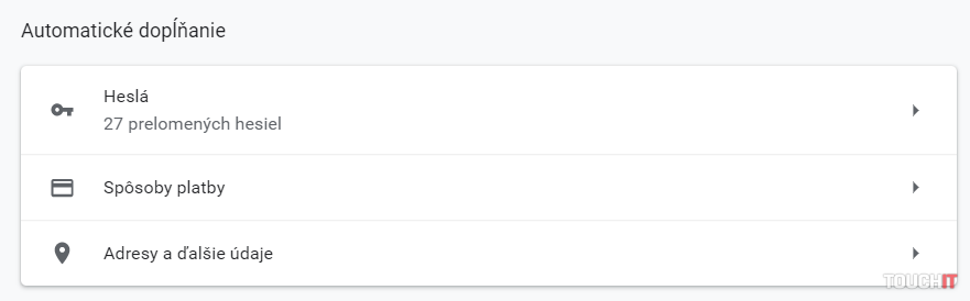 Vaše heslá uložené v prehliadači Chrome nájdete po otvorení karty Nastavenia v časti Automatické dopĺňanie. Kliknite na položku Heslá a zobrazí sa ich zoznam. Budú v skrytom stave a na to, aby sa zobrazili, je potrebné sa autorizovať heslom do vášho účtu vo Windows.