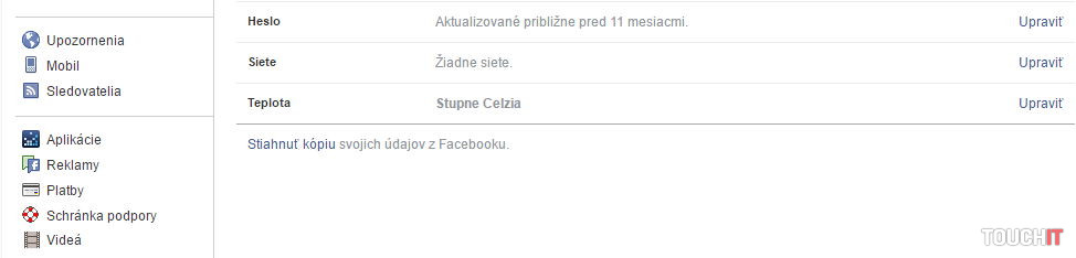 Tu zvolíte Nastavenia a úplne v spodnej časti nájdete odkaz Stiahnuť kópiu svojich údajov z Facebooku.